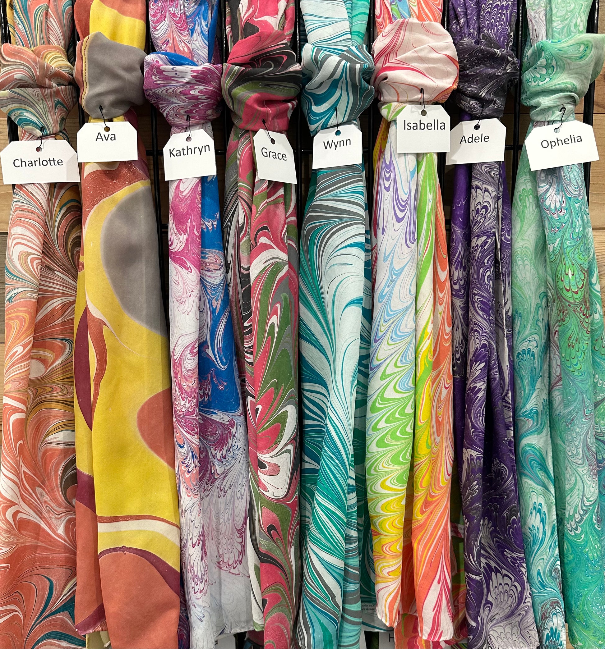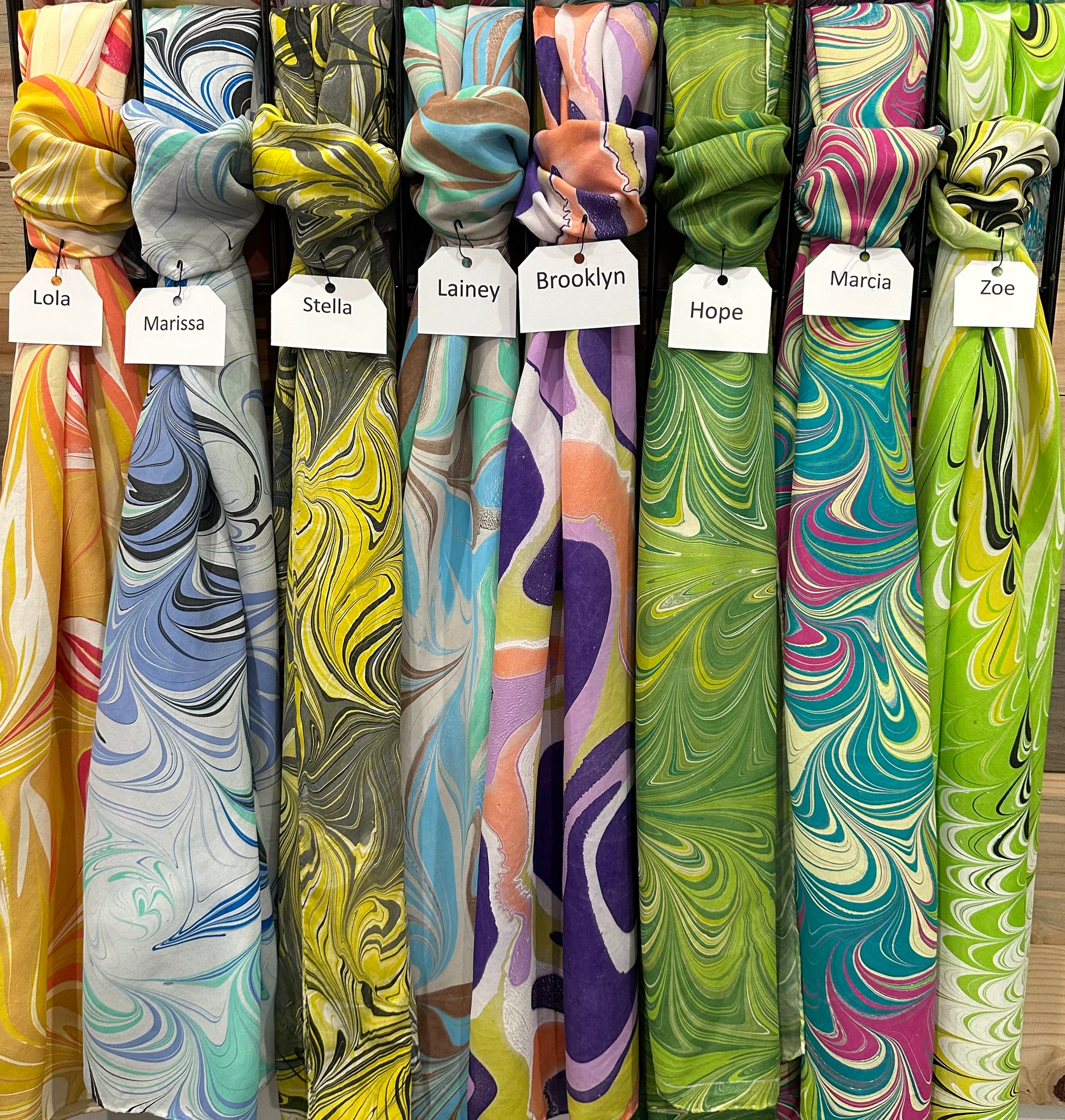 Our one-of-a-kind hand marbled scarves are designed to be worn, collected and admired. This Black Friday Buy One Get One 1/2 off our entire gallery of signature silk scarves. (Regular price $55 each. While supply lasts: 2 scarves for $82.50 Free shipping too!)