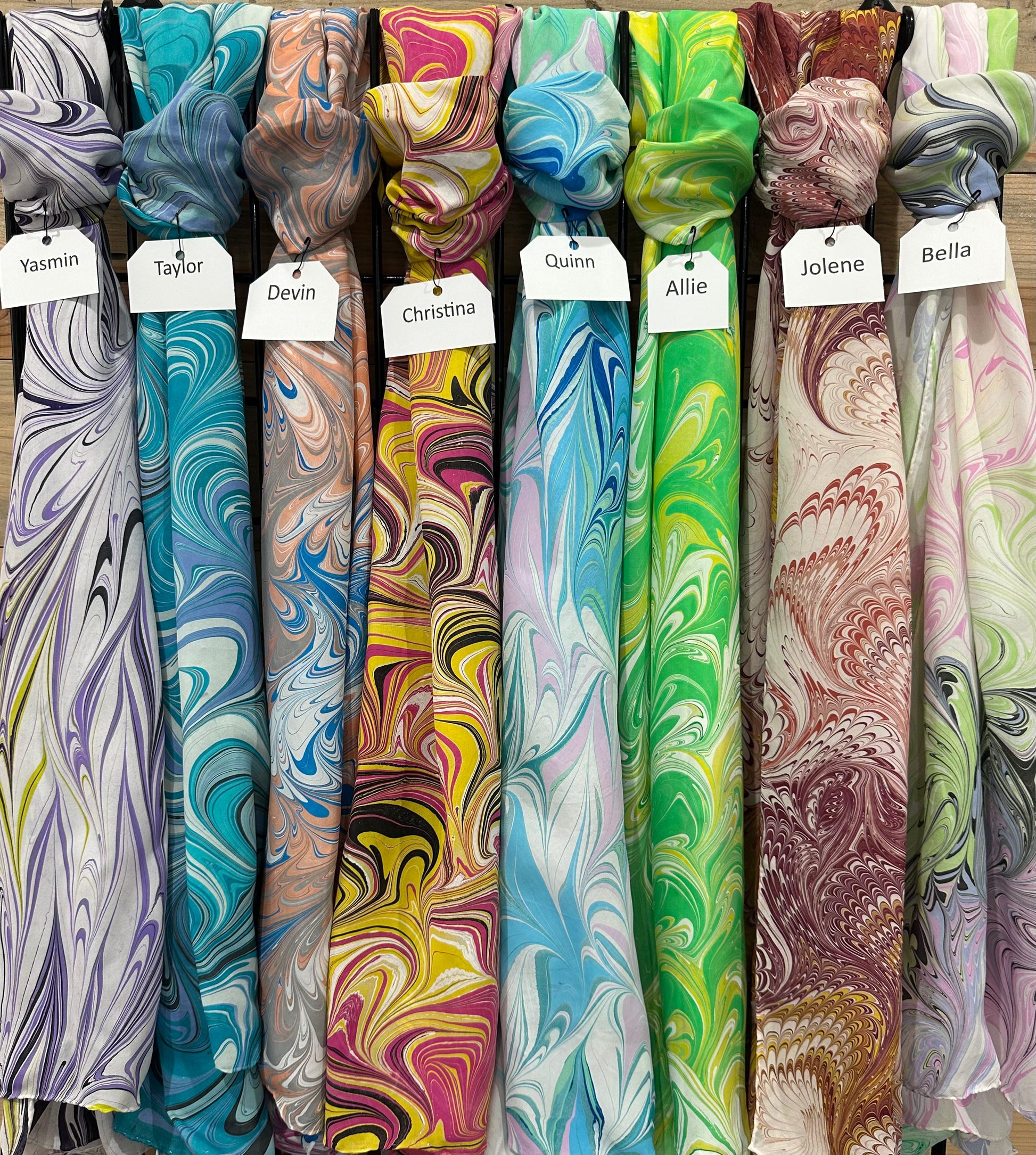 Limited availability. Each 100% silk scarf is approximately 14" x 72" hand created using water marbling technique. Electronic devices can display colors differently; therefore, variations in color hues may occur. Imperfections in hand-created art are expected and contribute to its charm and personality. Each scarf is a unique piece of wearable art.