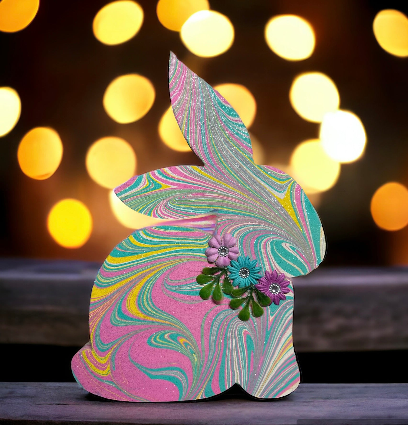 With a demonstration and guided instruction, experience the magical art of water marbling your choice of 9x7 chunky bunny, 11x8 easter egg or 9x7 cross. After marbling, heat dry it and add a bow, glitter, sealer and bling! (optional)